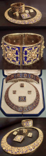 Стартовая цена ниже стоимости металла! Шедевр ювелирного искусства. Роскошный авторский набор. Италия. Середина ХХ века. Золото 750 пр., синяя эмаль. Общий вес: 364.47 гр. Выполнен по флорентийским образцам XIX века. Состав сета: колье (внутренний диаметр - 51 см, внешний - 61 см.), браслет, брошь, серьги-клипсы, кольцо (размер 17,25). Подпись мастера на каждом изделии. Оригинальный футляр.