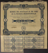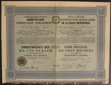 Акция. Общество Южно-Русской каменноугольной промышленности. Привилегированная акция. 100 руб.