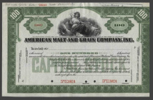 Акция. США. Делавэр. Американская солодо-зерновая Компания. Сертификат на 100 акций. Образец