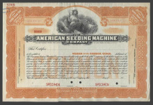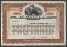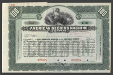 Акция. США. Огайо. Американская Компания посевных машин. Сертификат 100 акций по 100 дол. Образец