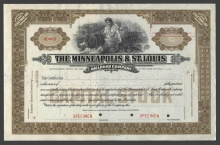 Акция. США. Айова. Ж/д Компания Минеаполиса и Сент-Луиса. Сертификат менее 100 акций. Образец