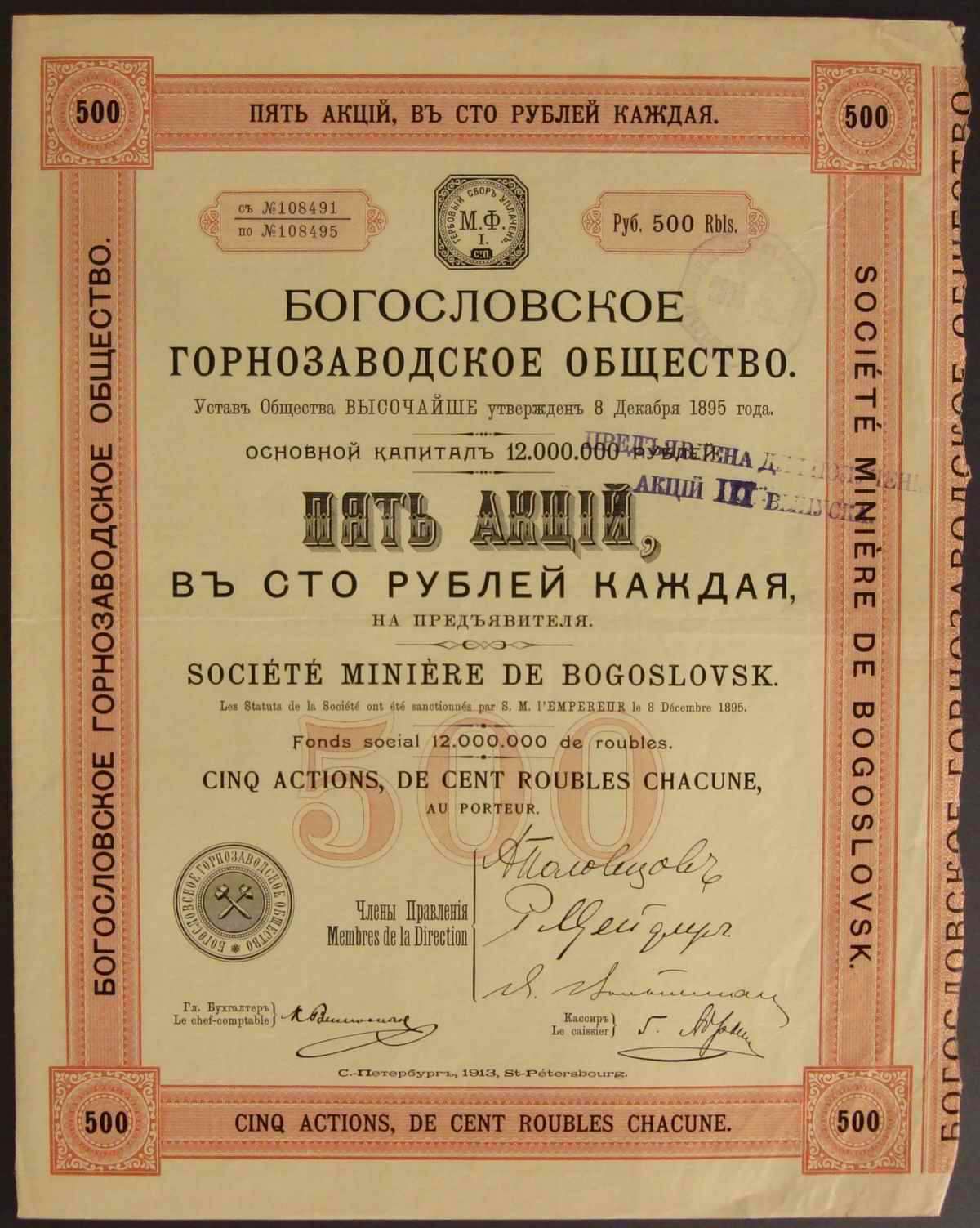 Акция. Богословское Горнозаводское Общество. 500 руб.