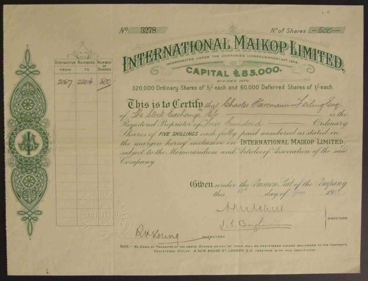 Акция. Майкопская международная компания. Сертификат на 500 обыкновенных акций.