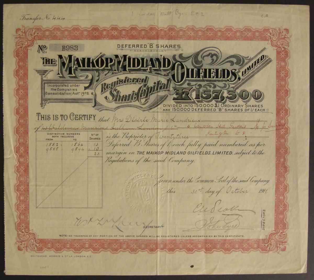 Акция. Майкопское общество нефтепромыслов "Мидленд". Сертификат на 23 акции.