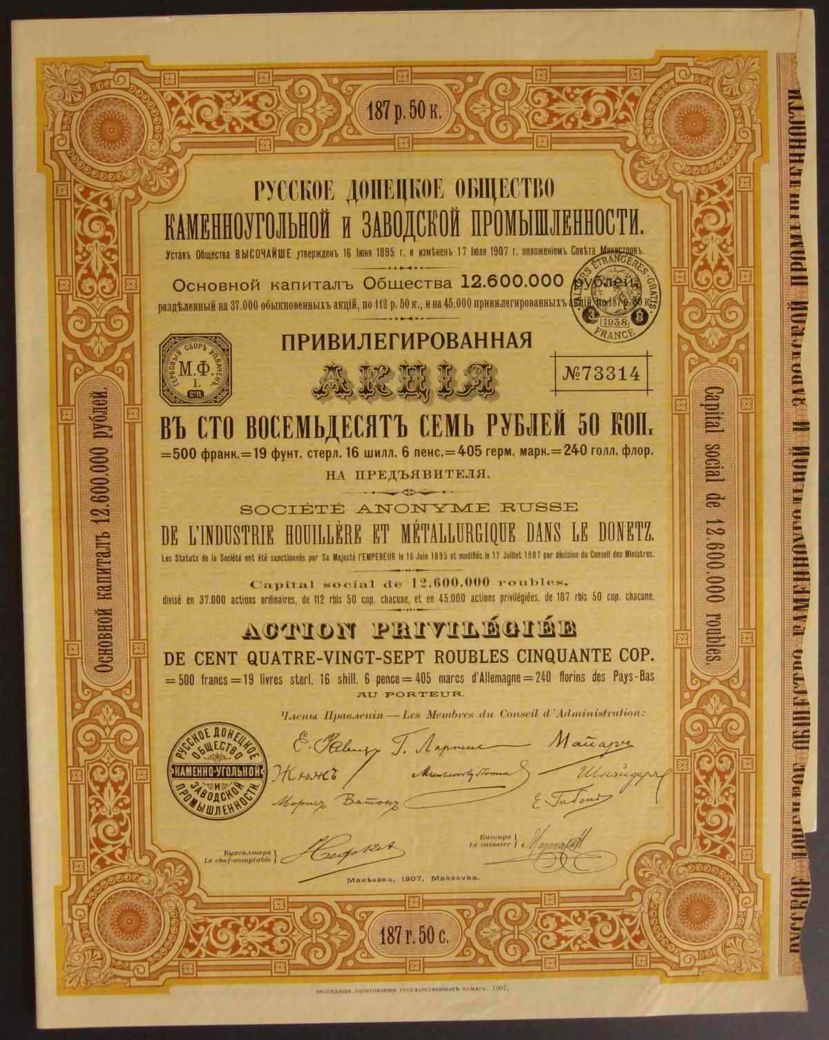 Акция. Русско-Донецкое о-во каменноугольной и заводской пром-сти. Привилег. акция в 187 руб. 50 коп.