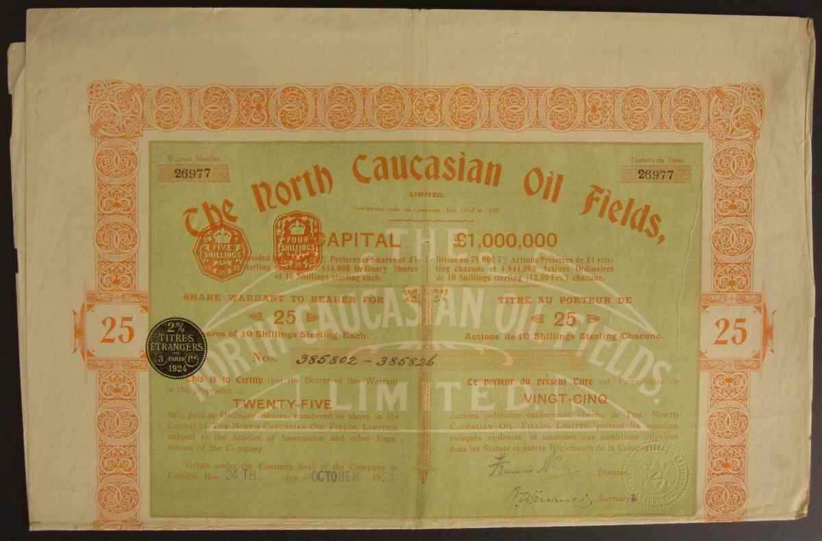 Акция. Северо-Кавказские нефтепромыслы. 25 акций по 10 шиллингов.