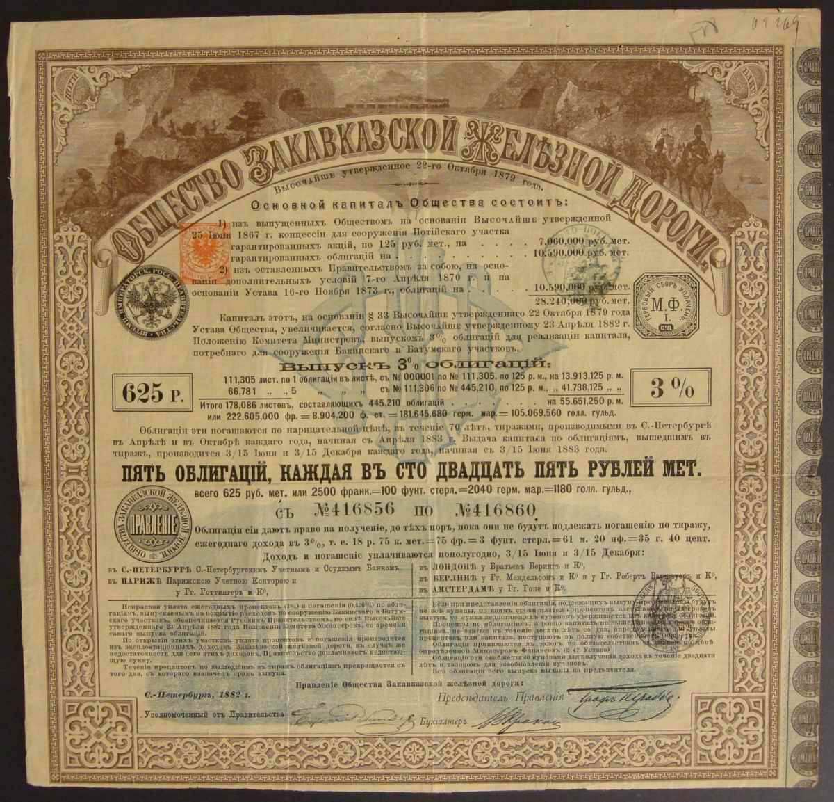 Облигация. Закавказская ж/д. 3%. 625 руб. (5 облигаций по 125 руб. каждая).