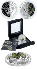 Серебро. 0,8oz. 0,999. 25,0 г. "Лунный календарь. Год змеи". 3D Частичное покрытие золотом 0,999 пробы и драгоценными камнями. В оригинальной капсуле и коробке-витрине с сертификатом.