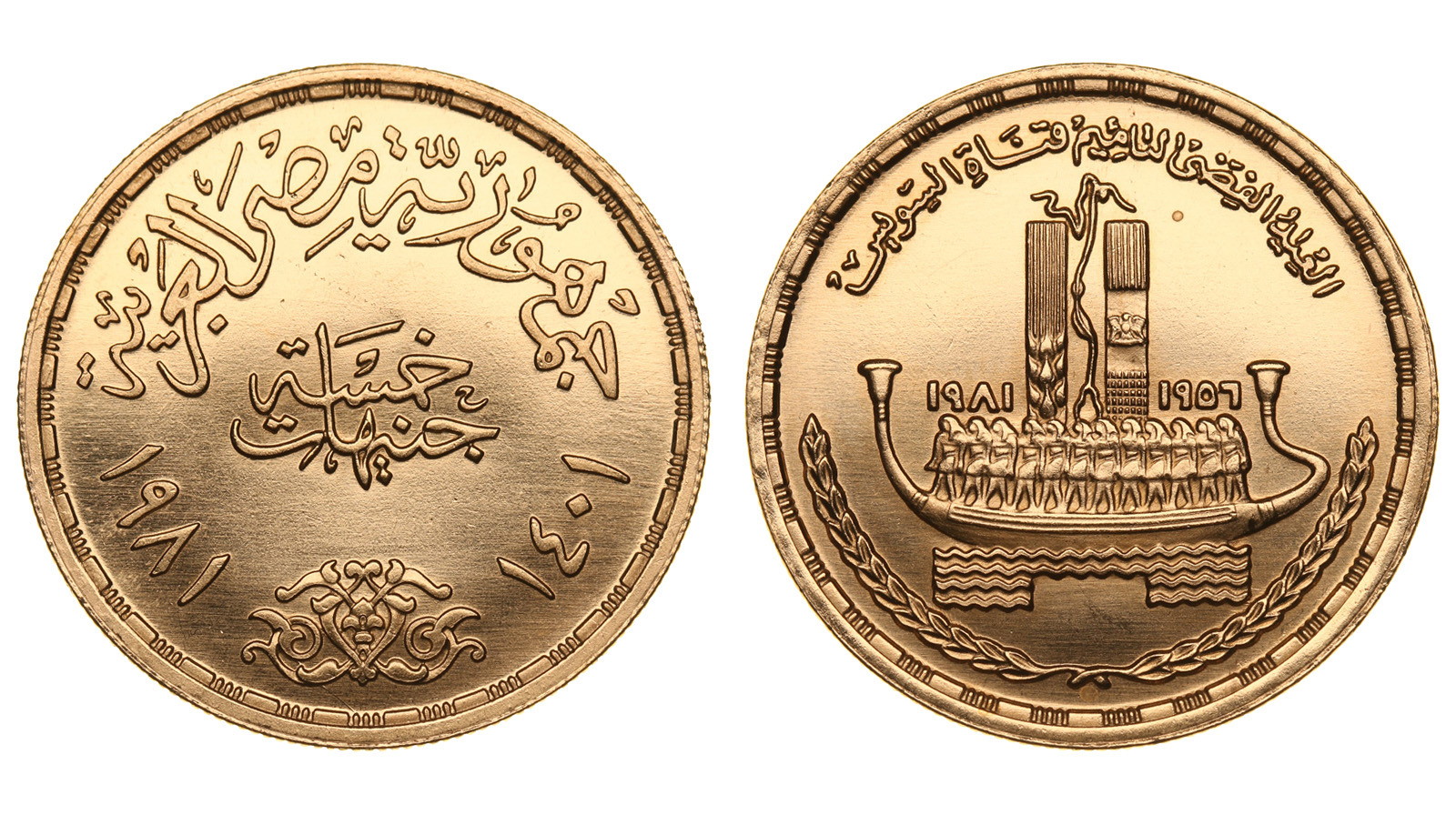 Редкая. Штемпельный блеск. Золото.. 0,7314 oz. 0,875. 26,0 г. "25-летие национализации Суэцкого канала". Тираж 1000 шт. КМ#537.