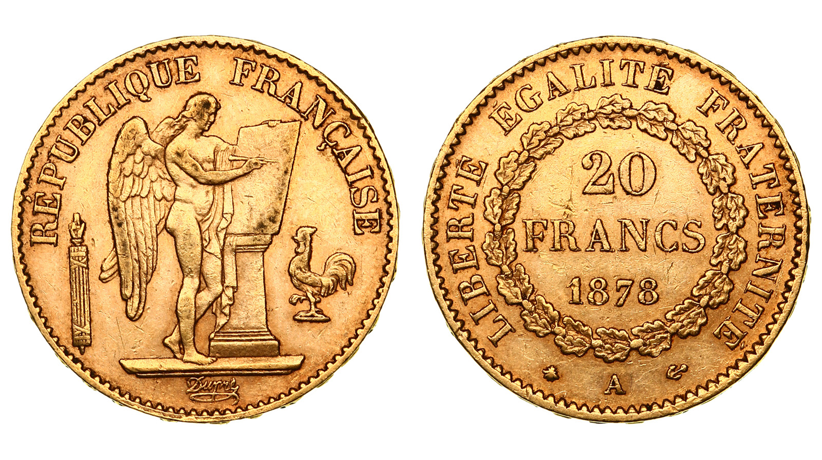 Золото. 0,9335 oz. 0,900. 32,26 г. м.д. Париж. Тип... Золото. 0,9335 oz. 0,900. 32,26 г. м.д. Париж. Тип 1907-1914 гг. с гуртовой надписью "LIBERTE EGALITE FRATERNITE". КМ#858.