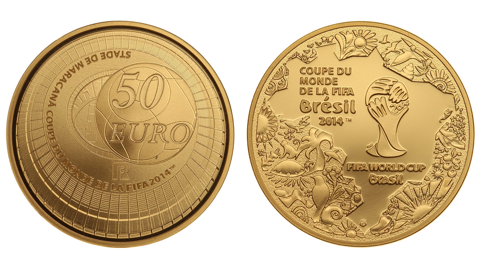Довольно редкая. Золото. 0,2499 oz. 0,920, 8,45 г. "ЧМ по футболу 2014". KM#2169. В оригинальной капсуле.