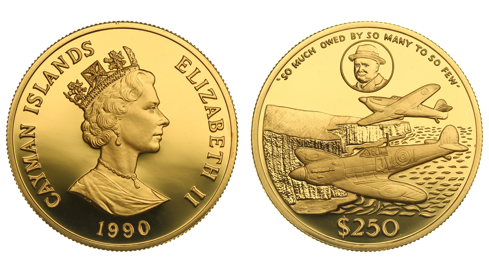 Редкая. Золото. 1,0024 oz. 0,999. 31,21 г. "Истребители «Спитфайр" на Дувром». Тираж не более 500 шт. КМ#107. В оригинальной капсуле.