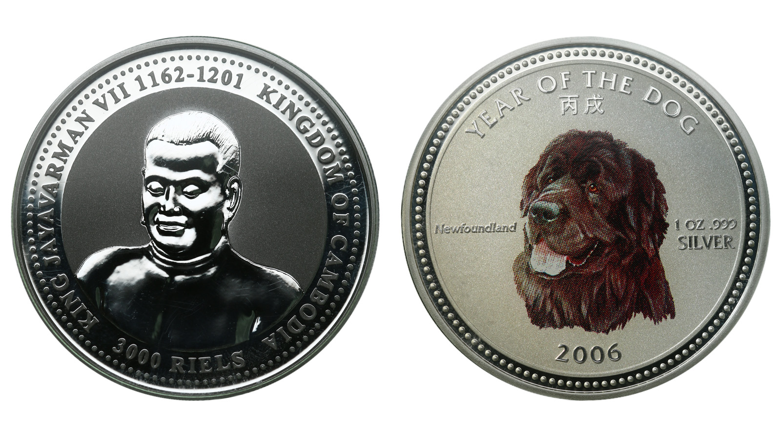 Серебро. 1,0 oz. 0,999. 31,1 г. "Год собаки. Ньюфаундленд". С цветной эмалью. В капсуле с сертификатом.