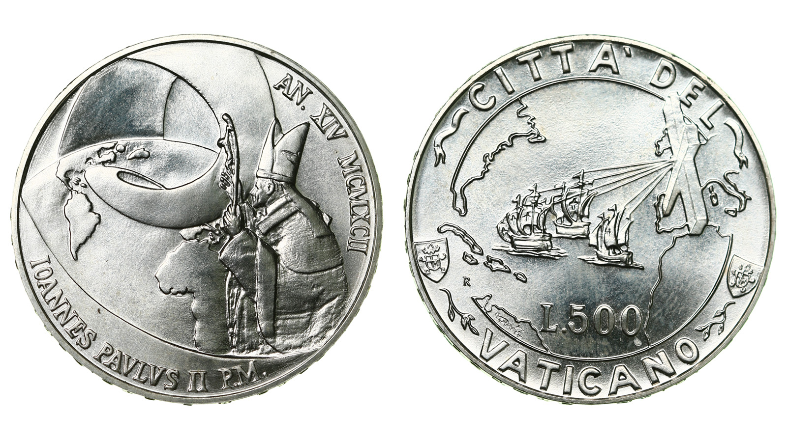 Серебро. 0,2953 oz. 0,835. 11,0 г. "Евангелизация Америки". КМ#235.