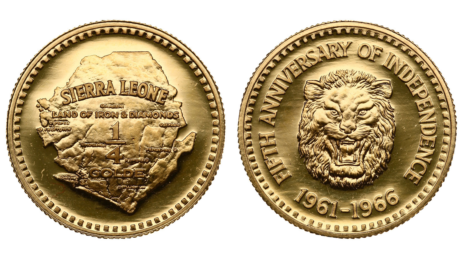 Редкая. Золото. 0,3946 oz. 0,900. 13,636 г. "5-я годовщина независимости". Тираж 600 шт. КМ#22а.