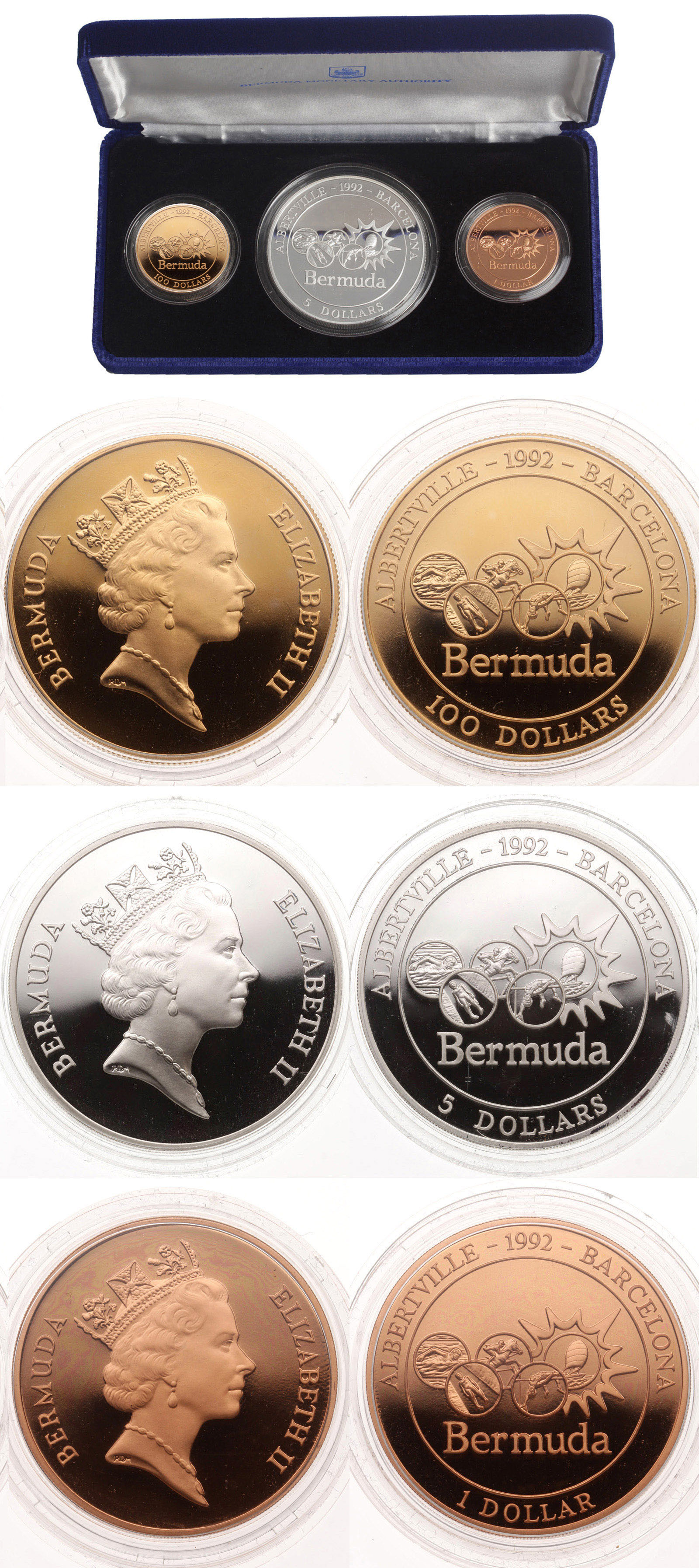 Очень редкий. Золото. 1,4016 oz. 0,917. 47,54 г. Серебро. 4,9949 oz. 0,999. 155,52 г. Бронза. "От Олимпийских игр в Альбервилле к Барселоне". Тираж набора - не более 250 шт. KM#PS12. В оригинальных капсулах и коробке. С сертификатом.