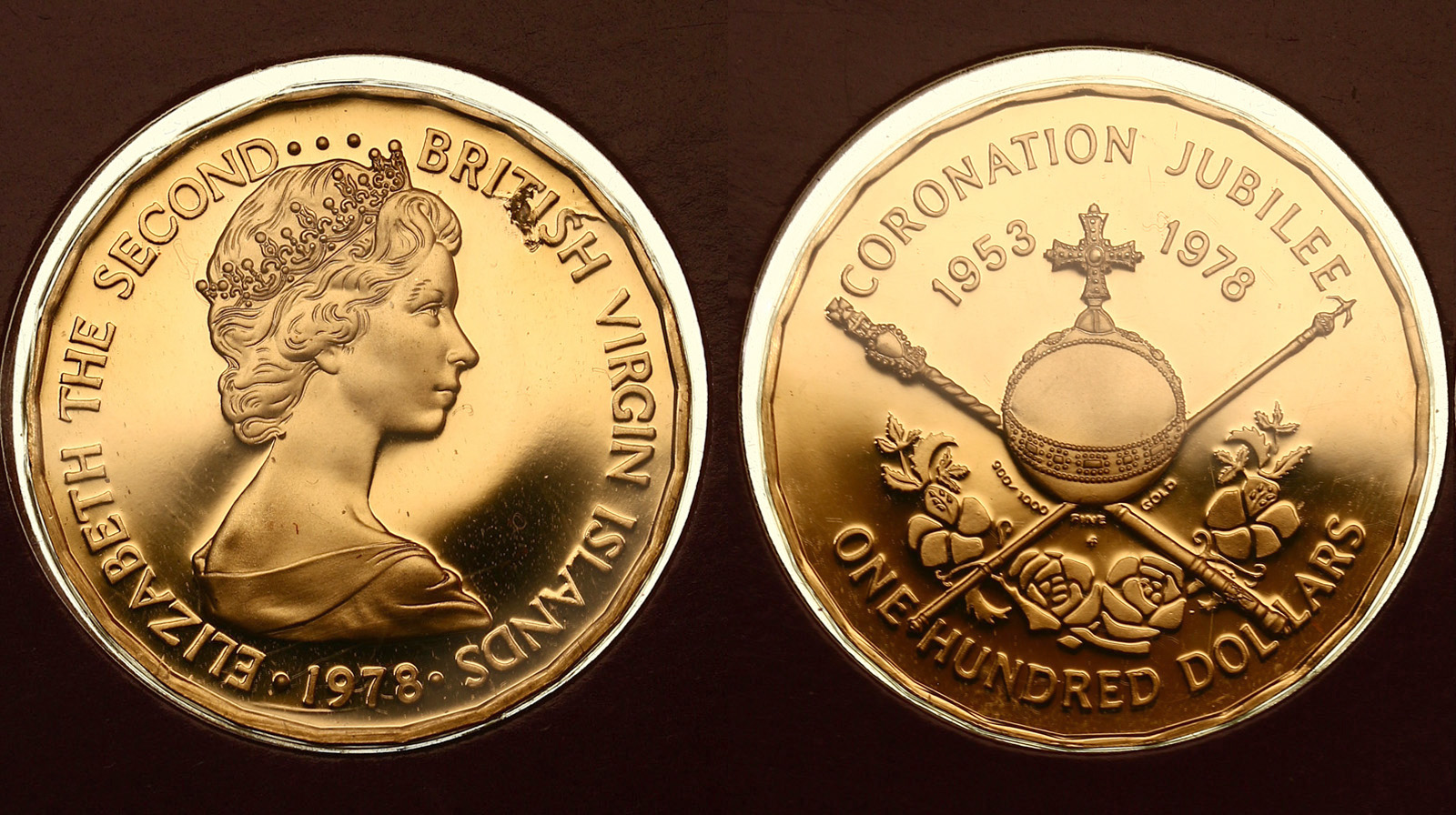 Довольно редкая. Золото. 0,2054 oz. 0,900. 7,1 г. "25-летие коронации Королевы". KM#23. В оригинальной упаковке Franklin mint.