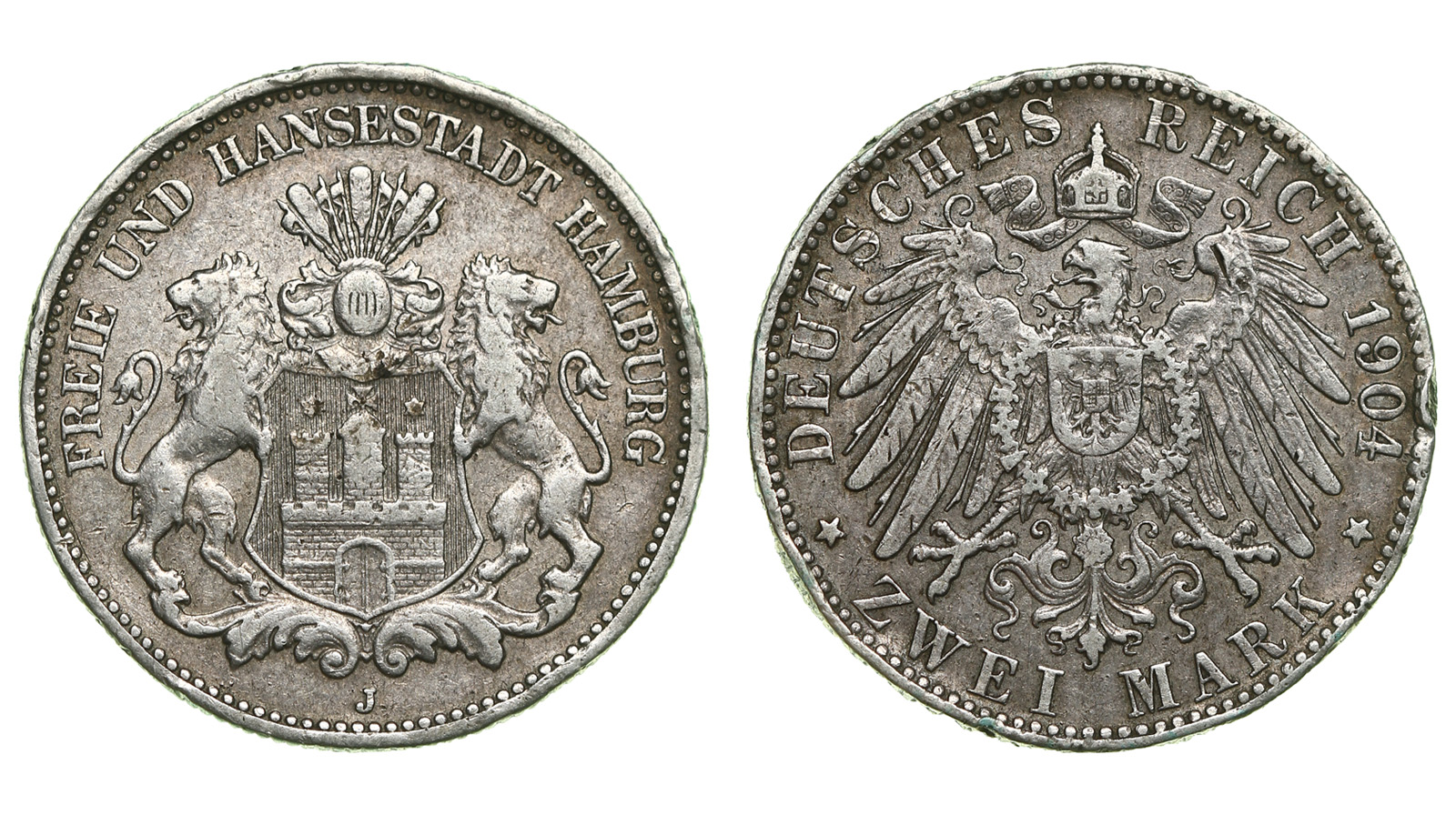 Серебро. 0,2411 oz. 0.500, 15,0 г. "100 лет... Серебро. 0,2411 oz. 0.500, 15,0 г. "100 лет городу Бремерхафен". КМ#50.