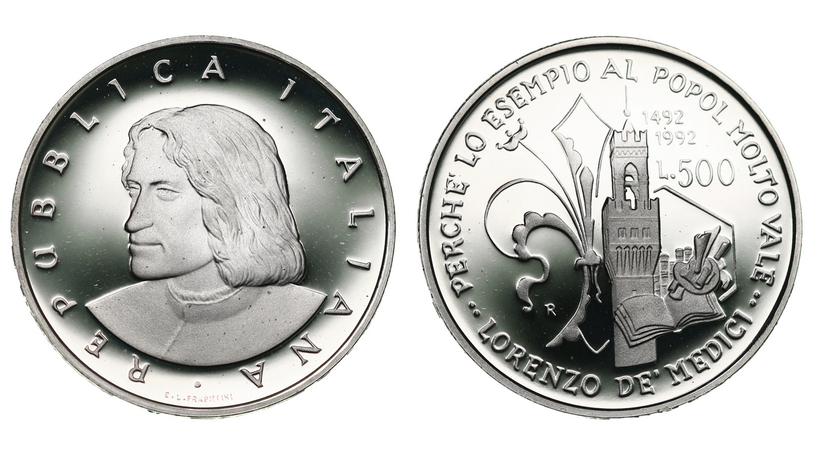 Серебро. 0,4027 oz. 0,835. 15,0 г. "500 лет со дня смерти Лоренцо Медичи". КМ#149. В капсуле.